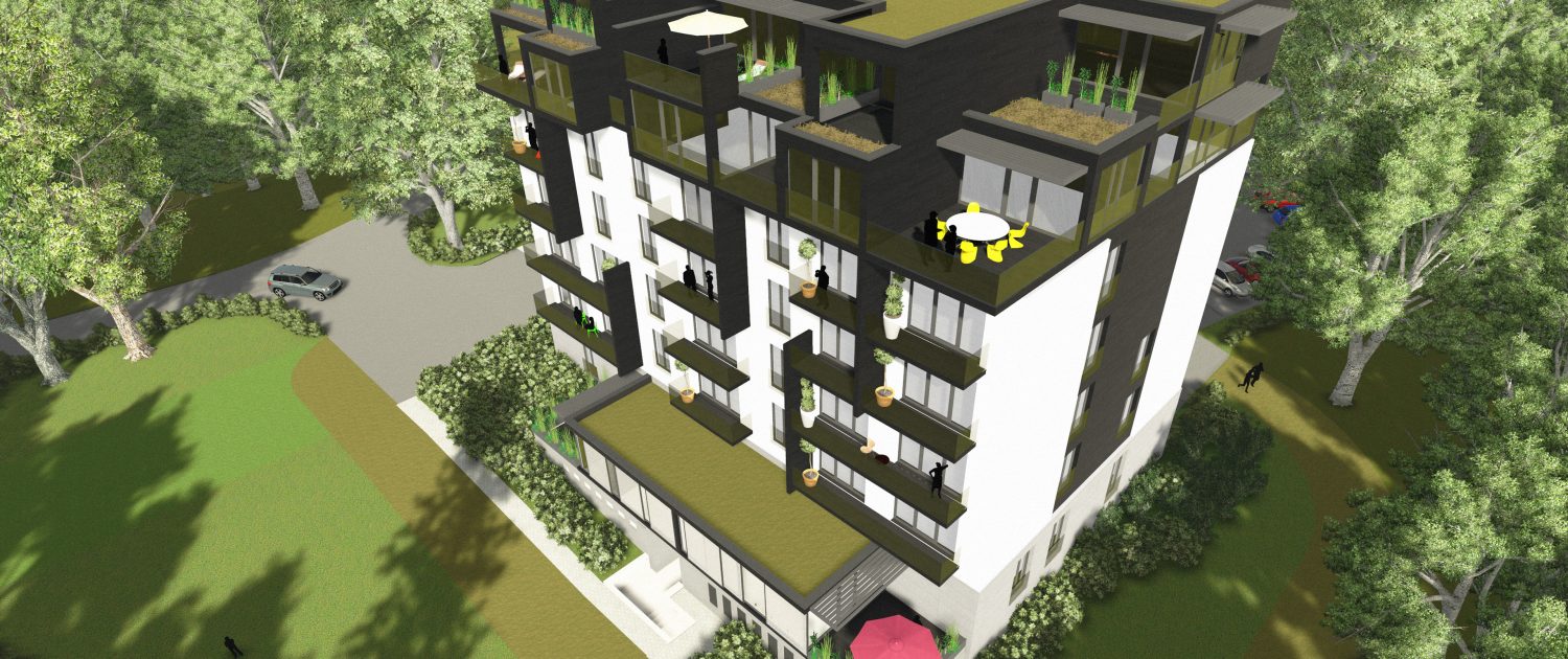 Les façades sont organisées par un rythme de plein et de vide en parfaite harmonie avec les espaces intérieurs. De plus, les modules verticaux en bois posés perpendiculairement aux façades en « brises vues », créent du relief par un jeu d’ombre portée et servent de structure aux balcons. Le design des balcons est très épuré, les garde-corps en verre sont de nature à minimiser leur impact visuel et, à optimiser le passage des rayons solaires et la vue pour les occupants.